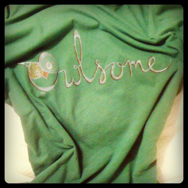 I am going all aboard with this owl stuff, might as well try all the colors in the world! Like, um, glitter. This ultra soft green cotton tshirt is blessed with owlsome goodness!!